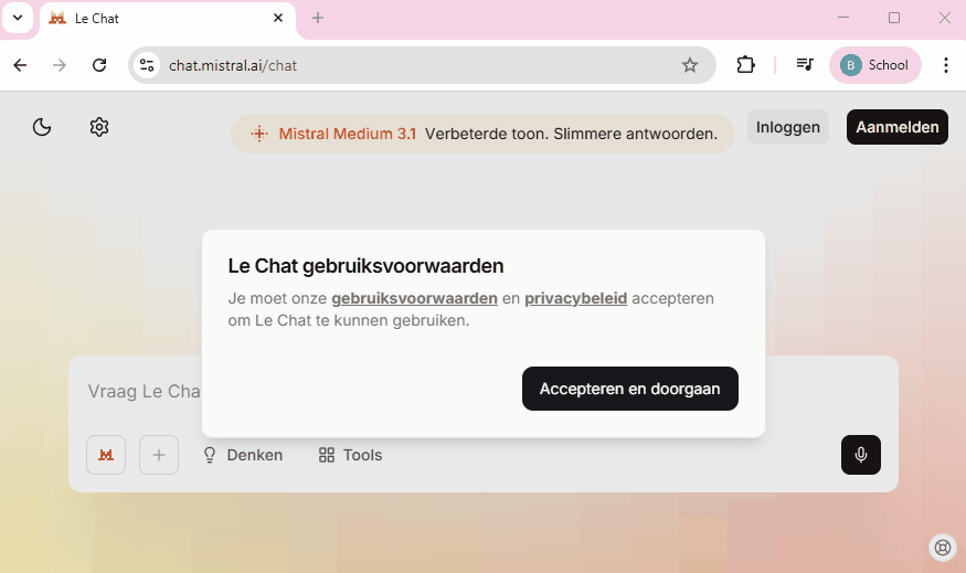 Het meest ideale model voor onderwijs (veilig, transparant en zonder vendor lock-in) is Le Chat, een AI-model ontworpen met focus op Europese privacywaarden en GDPR-compliance. Gebruikers kunnen zonder account werken en hebben de optie om modeltraining met hun data uit te schakelen (opt-out via de instellingen bovenaan).