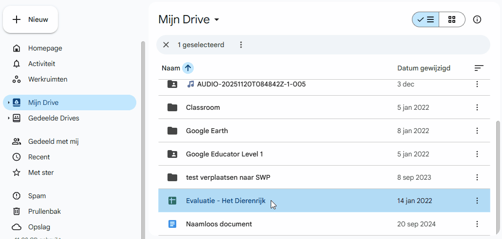 Jouw taak: De bestanden van je persoonlijke 'Mijn Drive' (spijker.be) verplaatsen naar een speciale 'Gedeelde Drive' (mirho.be).