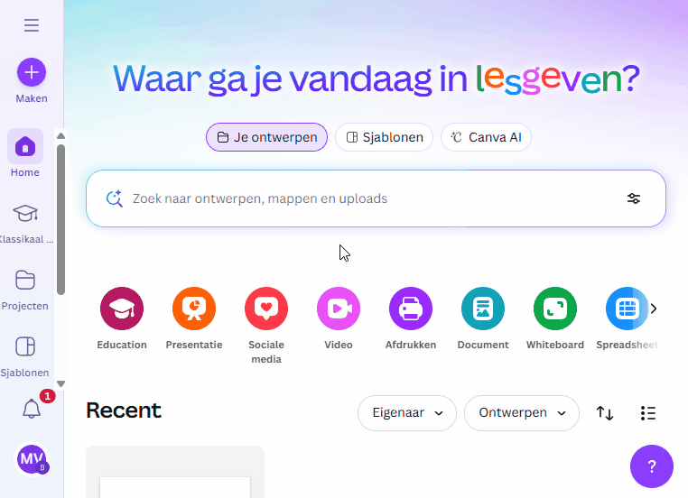 Zodra je je aanmeldt bij Canva met je @mirho.be-adres, wordt er automatisch een nieuw Canva Education-account aangemaakt. Een Canva Education-account is een gratis premiumversie van Canva, speciaal ontworpen voor het onderwijs. Het biedt toegang tot alle betaalde functies van Canva Pro, plus extra hulpmiddelen die gericht zijn op het klaslokaal.