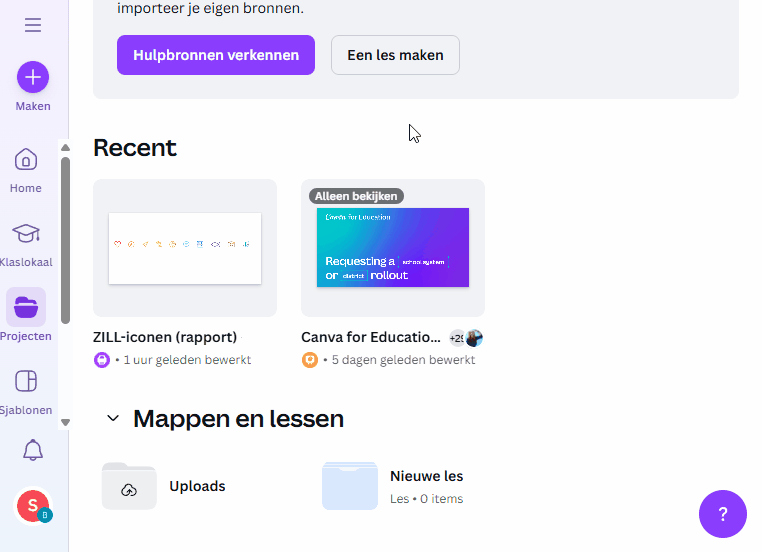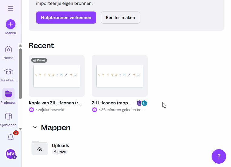 Via Projecten in Canva. Staat het ontwerp nog niet in Projecten? Klik dan eerst in je Canva-meldingen op het gedeelde ontwerp; daarna verschijnt het automatisch in je Projecten-map.