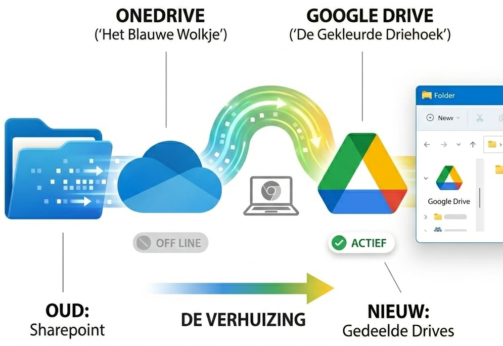 We gaan niet eerst via een tijdelijke tussenstop, maar verhuizen je bestanden in één keer direct naar de nieuwe Google Gedeelde Drives. Dat betekent minder handelingen en sneller wennen aan je definitieve werkplek.