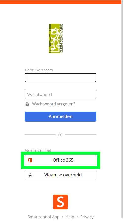 Je kan op Smartschool aanmelden met deze gegevens, óf met je Microsoft account door te klikken op de Office 365 knop op de aanmeldpagina.